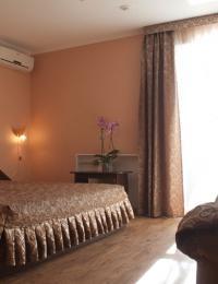 1 комнатный 3-х местный «люкс» Площадь номера 25 кв.м. Комплектация: двуспальная кровать, шкаф, комод, зеркало, туалетный столик, мягкая мебель (раскладное кресло), спутниковое ТV, холодильник, кондиционер, набор посуды.